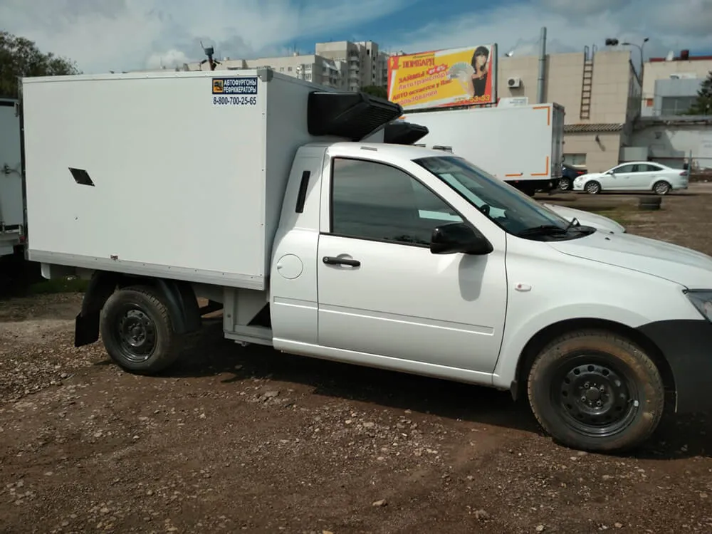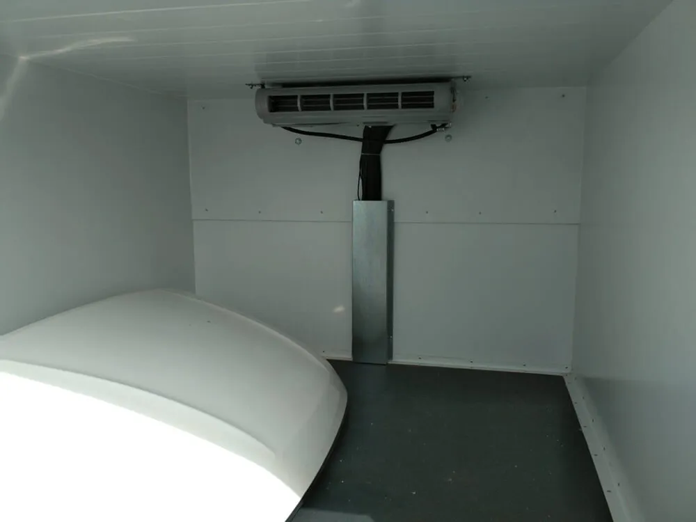 Изготовлен под установку холодильного оборудования, с усиленными порталами и изотермией, для охлажденных и замороженных продуктов. Внешняя и внутренняя обшивка – плакированный металл, пол – шероховатый пластик, портал нержавеющая сталь. Двери задние распашные. Запоры штанговые одинарные.
