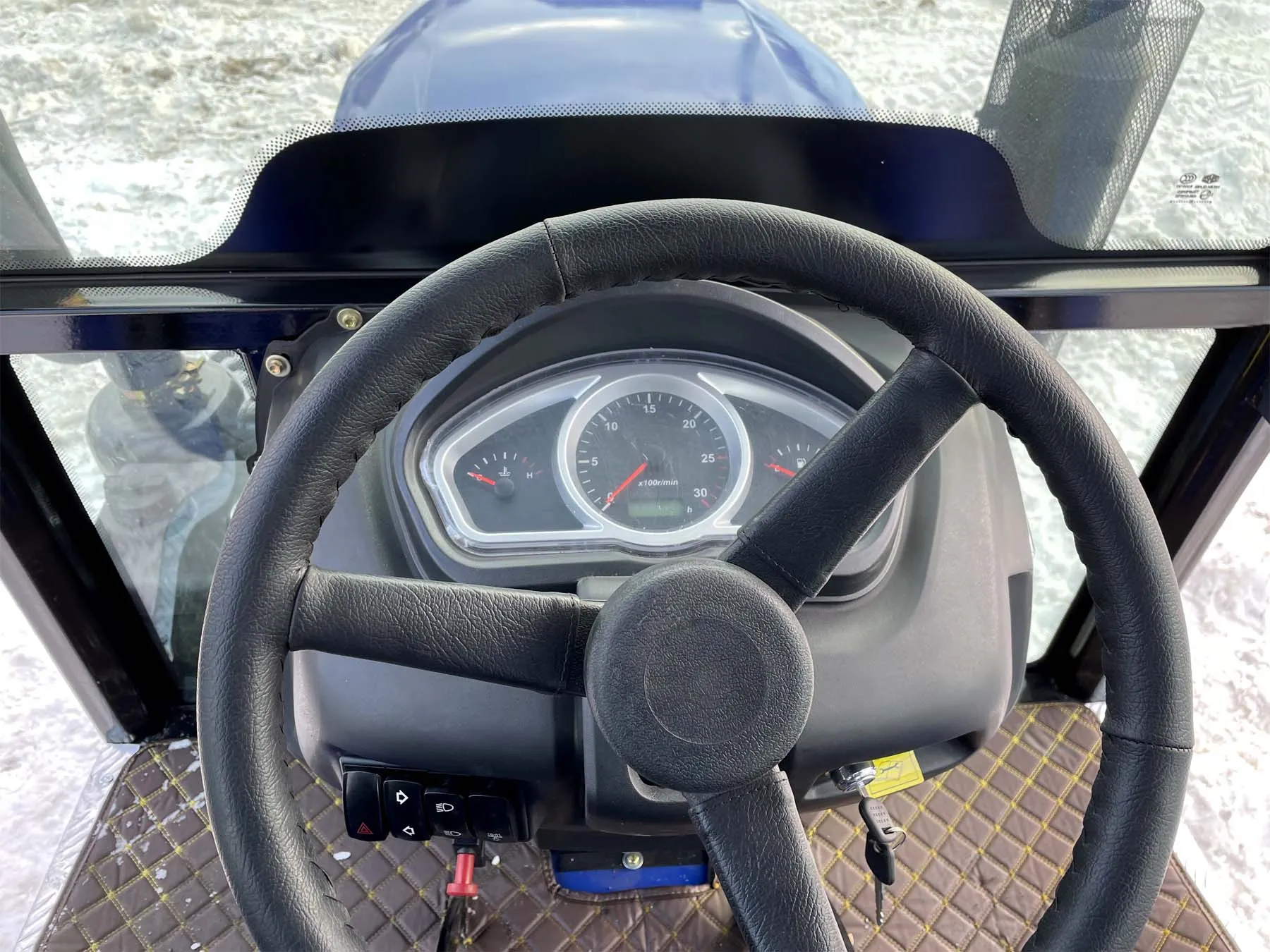 Установленная на тракторе кабина соответствует требованиям сертификации OECD и отличается современным европейским дизайном. Панорамное остекление обеспечивает водителю удобный обзор, а наличие отопителя ‒ комфортные условия работы в холодную погоду.